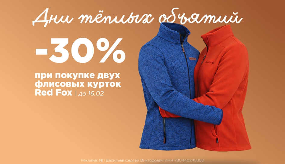 С 12 по 16 февраля магазины Red Fox и «Планета Спорт» объявляют Дни тёплых объятий! И дарят -30% при покупке двух флисовых курток Red Fox!